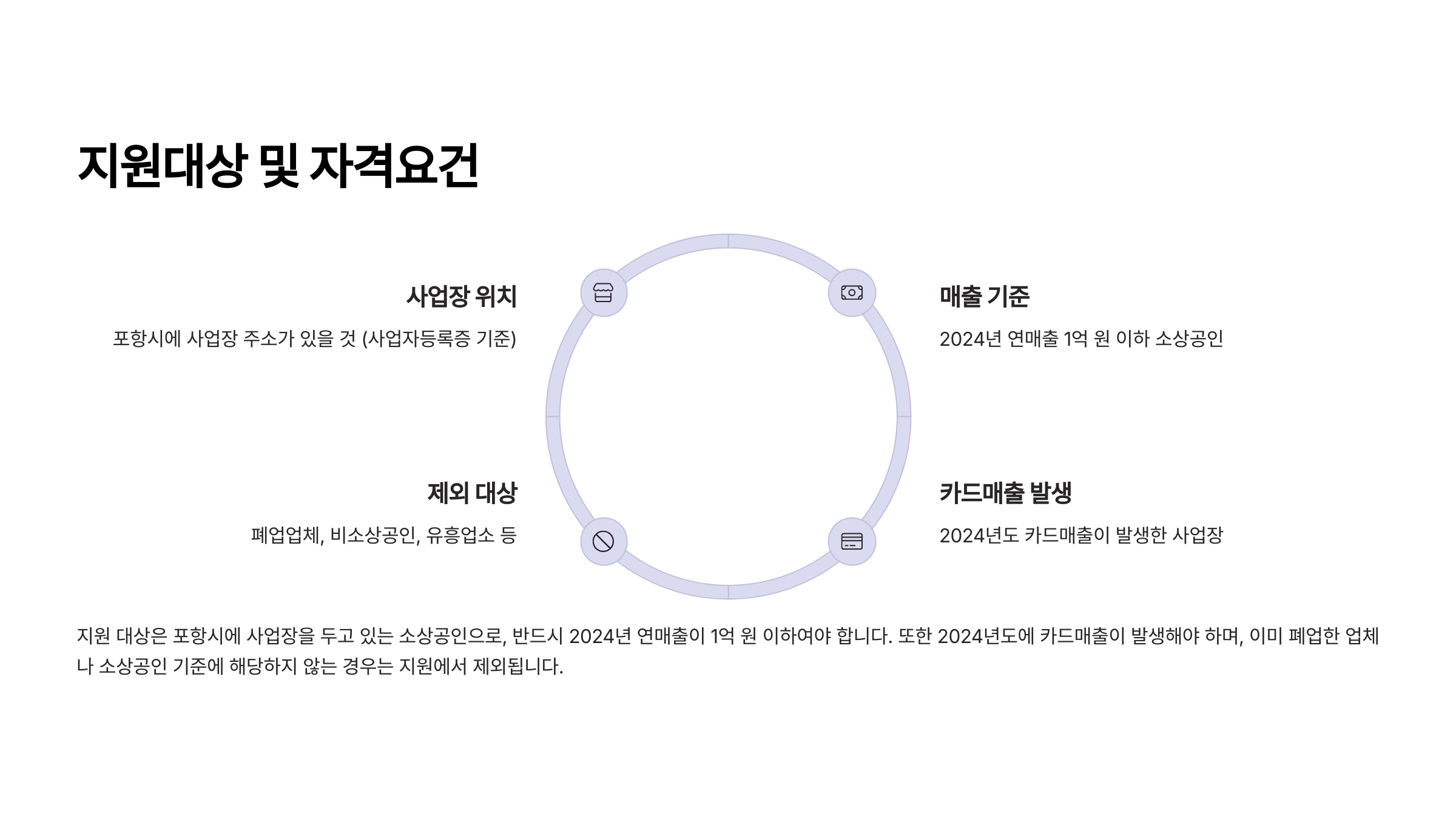 | 지원대상 | 포항시에 사업장을 둔 연 매출 1억 원 이하 소상공인 |